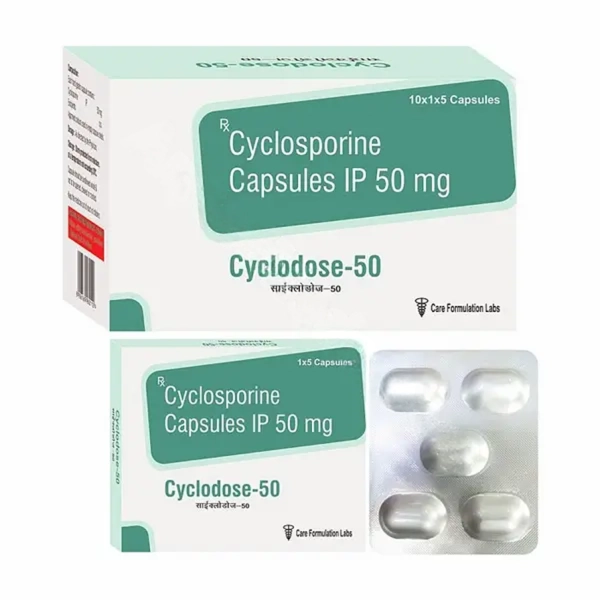Cyclodose 50 mg is a medication containing cyclosporine, an immunosuppressant drug used to prevent organ rejection in transplant recipients.