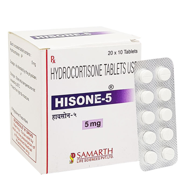 Hisone 5 mg contains Hydrocortisone and is used to treat allergies, inflammation, asthma, autoimmune disorders, ulcerative colitis, and certain cancers.