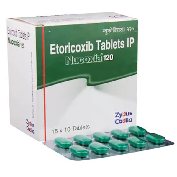 Nucoxia 120 mg Tablet contains Etoricoxib, a powerful nonsteroidal anti-inflammatory drug (NSAID) used to relieve pain and inflammation in conditions like arthritis, ankylosing spondylitis, and gout.