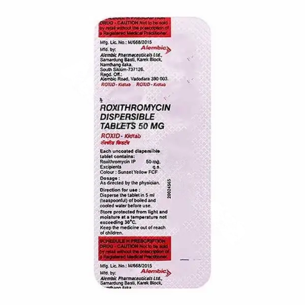 Roxithromycin 50 mg tablets, an effective macrolide antibiotic used to treat mild bacterial infections of the throat, lungs, and skin.